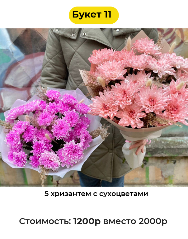 Букет 11 «5 хризантем с сухоцветами» - 1200 руб. вместо 2000 руб. (Купон за 119 руб.)