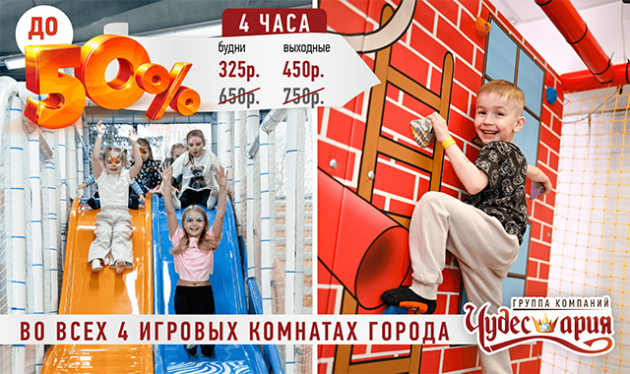 • Купон даёт скидку до 50% на посещение детской игровой комнаты «Чудесария».