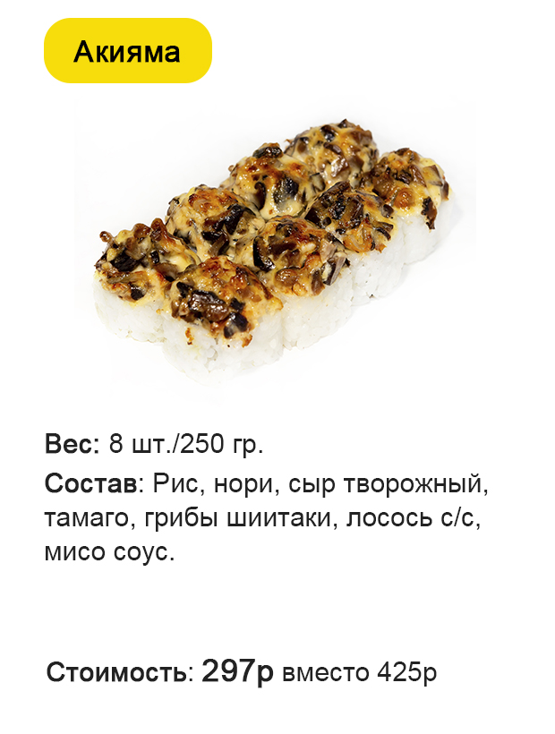 Состав: 8 шт. / 230 г. (Рис, нори, сыр творожный, тамаго, грибы шиитаки, соус унаги кунжут)