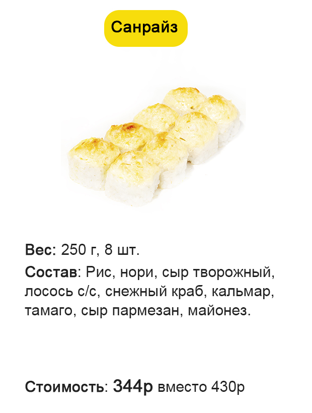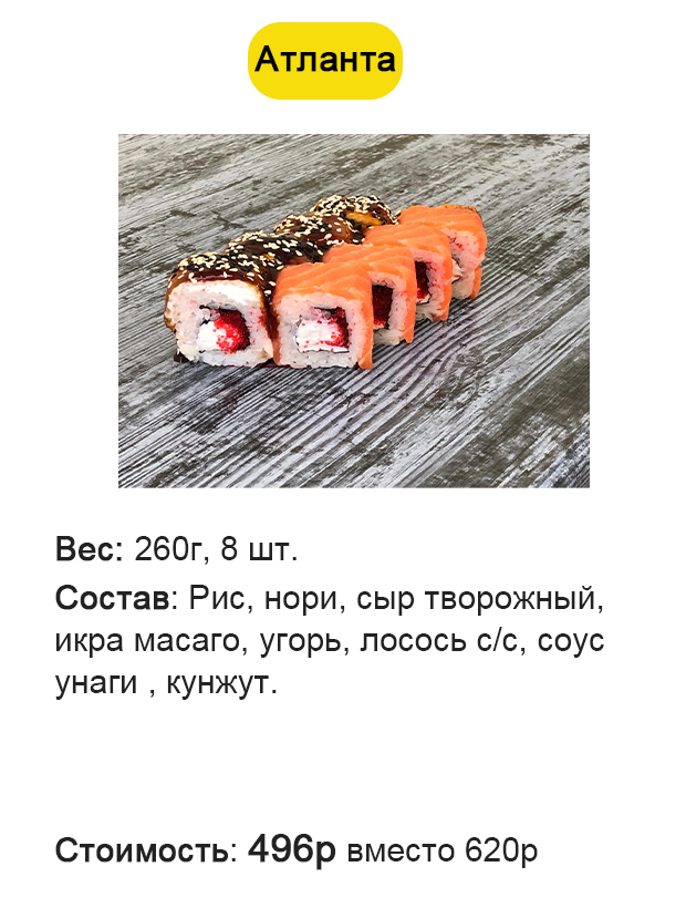 Состав: Hara kiri (Рис, ории, лосось с/с, снежный краб, огурец, тамаго, кальмар, майонез, икра масаго), Биг темпура (Рис, нори, майонез огурец, креветка темпура), Фуджи (Рис, нори, сыр творожный, огурец, тамаго, грибы шиитаки, угорь, мисо соус), Санрайз (Рис, нори,сыр творожный, лосось с/с, снежный краб, кальмар, тамаго, сыр пармезан, майонез), Ролл с лососем (Рис, нори, лосось), Калифорния в кунжуте (Рис, нори, сыр творожный, снежный краб, огурец, кунжут), Зеленая река (Рис, нори, лосось с/с, сыр творожный, огурец, укроп), Большой классический ролл с омлетом и огурцом.