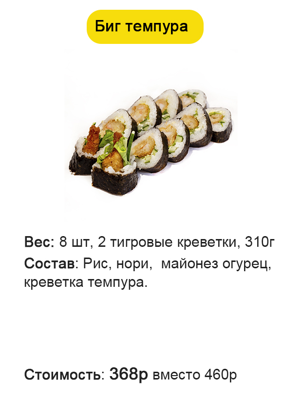 • Биг темпура, 8 шт, 2 тигровые креветки, 310г – 368 руб. вместо 460 руб.