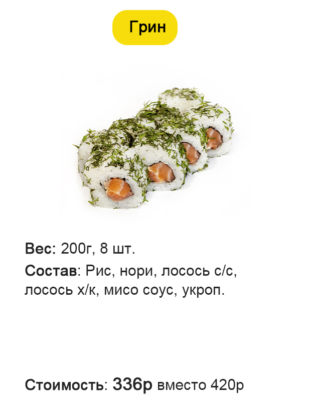 Состав: 8 шт. / 200 г. (Рис, нори, лосось с/с, сыр творожный, огурец, укроп)• Стоимость для вас - 270 руб. вместо 385 руб.