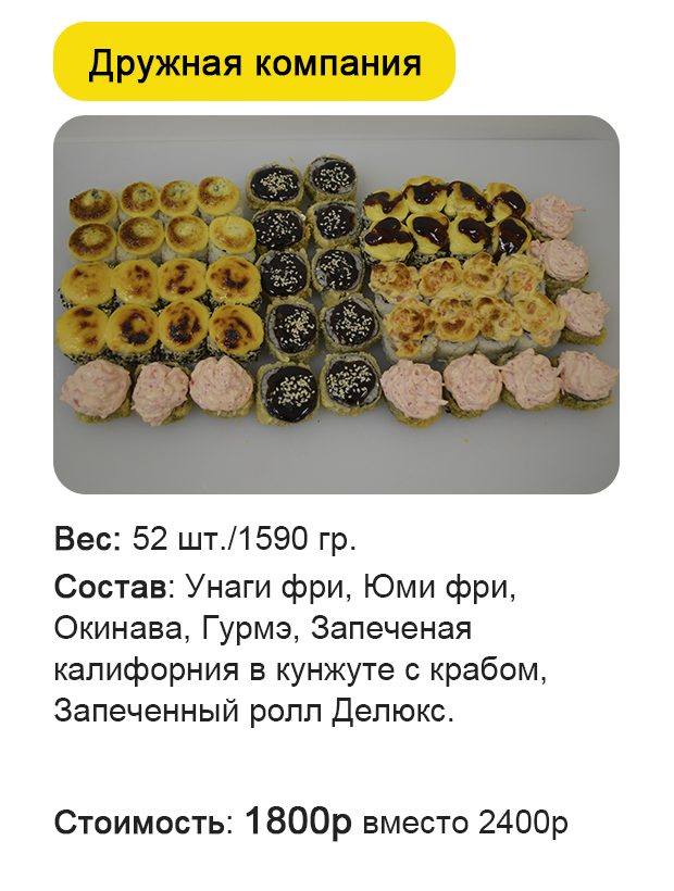 Состав: Унаги фри (Рис, нори, сыр творожный, тамаго, грибы шиитаки, соус унаги кунжут), Юми фри (Рис , нори, сыр творожный,тамаго, огурец, снежный краб,майонез, икра масаго), Окинава (Рис , нори,сыр творожный,лосось х/к,кальмар,сыр дор-блю, мисо соус), Гурмэ (Рис, нори, сыр творожный, курица, тамаго, кунжут, сырный соус унаги), Запеченая калифорния в кунжуте с крабом (Рис, нори, сыр творожный, снежный краб, огурец, кунжут), Запеченный ролл Делюкс (Рис, нори, сыр творожный, снежный краб, лосось с/с, огурец, мисо соус).