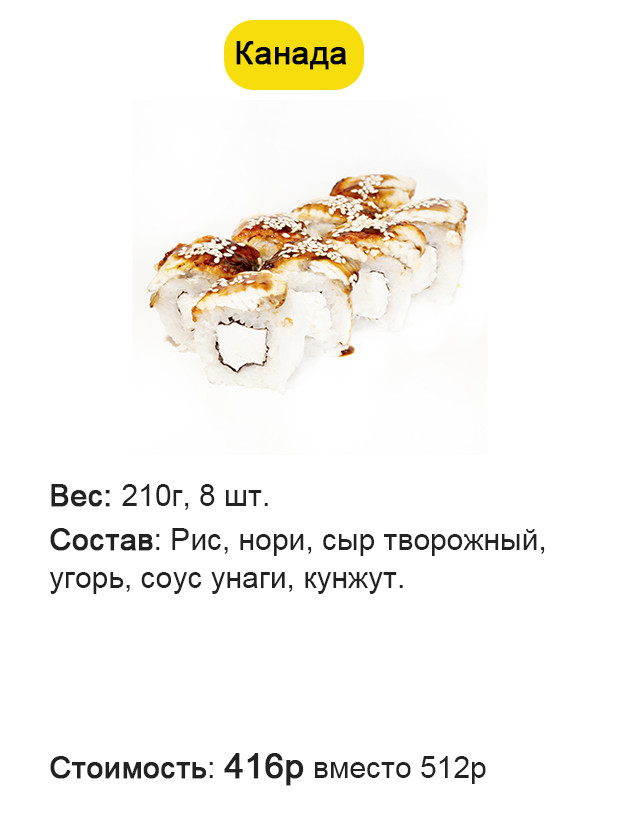 - Рис, нори, сыр творожный, икра масаго, угорь, лосось с/с, соус унаги , кунжут.