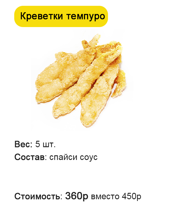 • Креветки темпуро, спайси соус, 5 шт. – 360 руб. вместо 450 руб.
