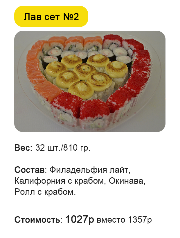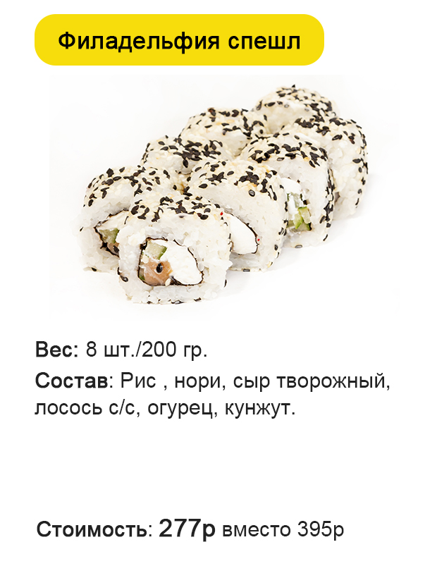 Состав: Филадельфия лайт (Рис, нори, сыр творожный, огурец, лосось), Калифорния с крабом (Рис, нори, майонез, огурец, снежный краб, икра масаго), Окинава (Рис , нори,сыр творожный,лосось х/к,кальмар,сыр дор-блю, мисо соус), Ролл с крабом (Рис, нори, снежный краб).