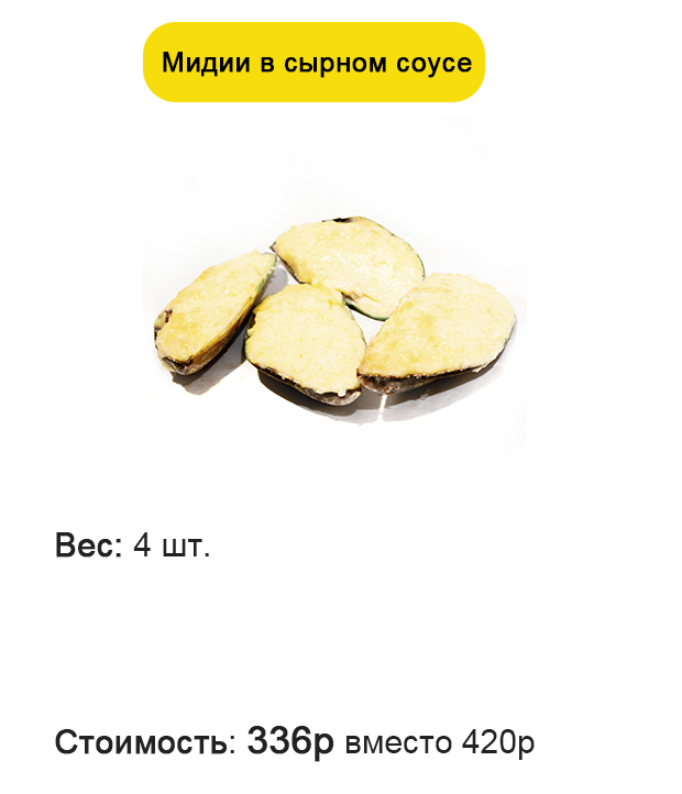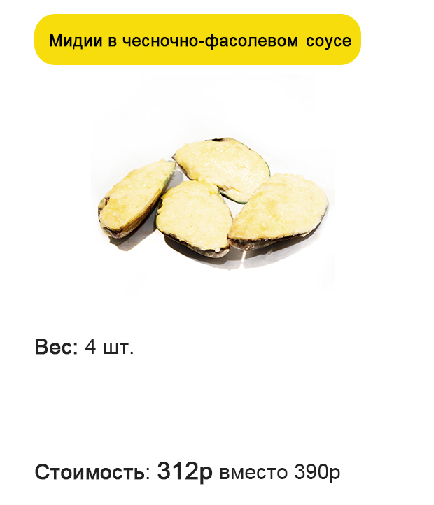 • Мидии в чесночно-фасолевом соусе, 4 шт. – 312 руб. вместо 390 руб.