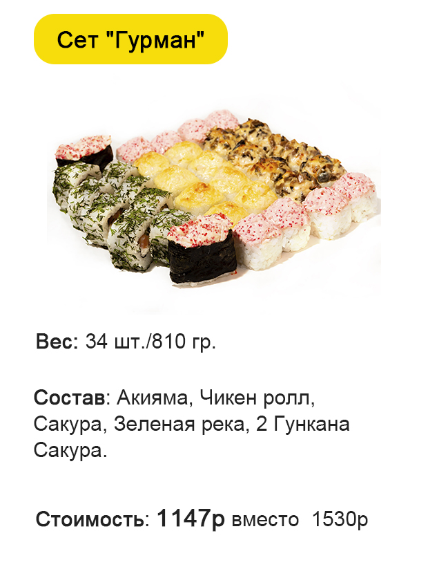 Состав: Акияма (Рис, нори, сыр творожный, тамаго, грибы шиитаки, лосось с/с, мисо соус), Чикен ролл (Рис, нори,сыр творожный, курица, сырный соус, сыр дор-блю), Сакура (Рис, нори, сыр творожный, снежный, краб, тамаго, майонез, икра масаго), Зеленая река (Рис, нори, лосось с/с, сыр творожный, огурец, укроп), 2 Гункана Сакура (Рис, нори, сыр творожный, снежный, краб, тамаго, майонез, икра масаго).