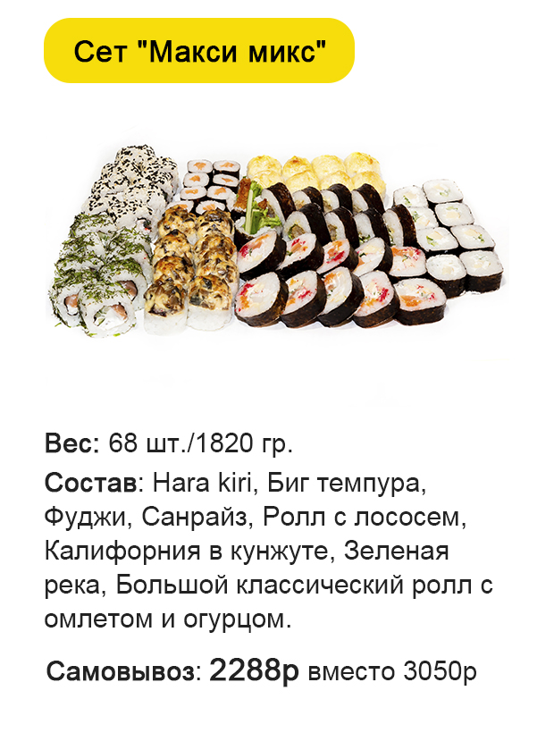 • Стоимость для вас - 1147 руб. вместо 1530 руб.Сет «Макси микс» (68 шт.) 1820 гр.