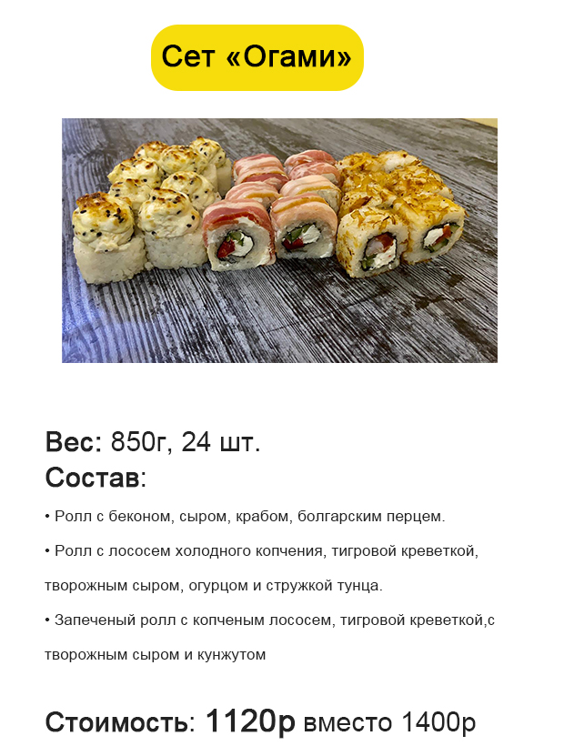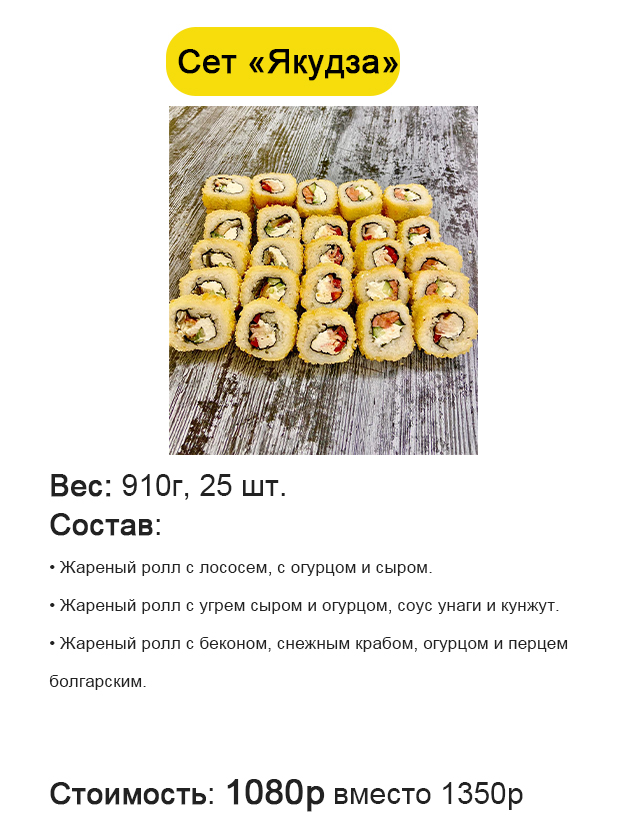 - Рис, нори, сыр творожный, тамаго, тигровая креветка, окунь, сырный соус, соус унаги.СЕТЫ