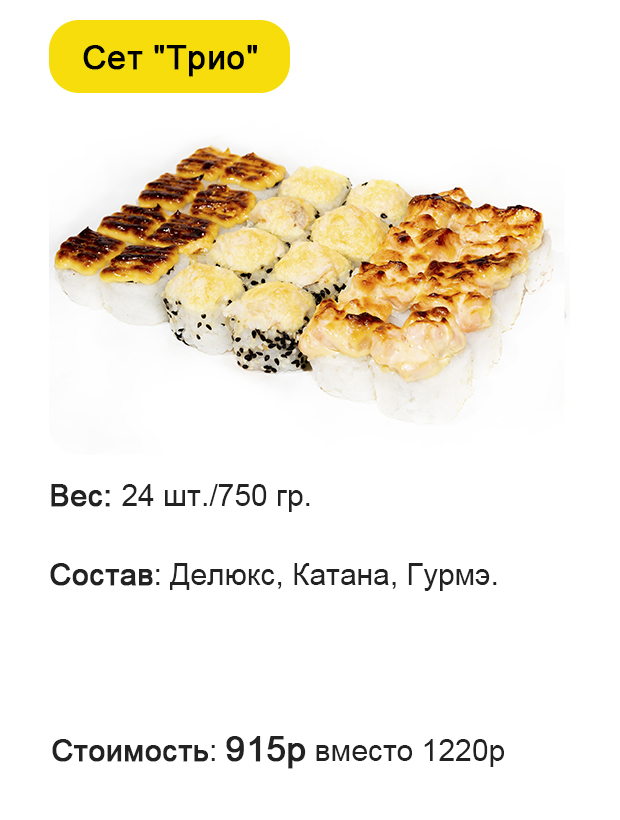 • Стоимость для вас - 2288 руб. вместо 3050 руб.Сет «Трио» (24 шт.) 750 гр.