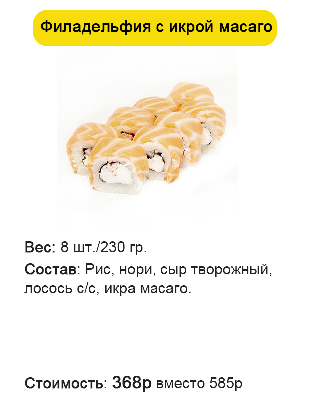 • Филадельфия с икрой масаго, 230г, 8 шт. – 468 руб. вместо 585 руб.