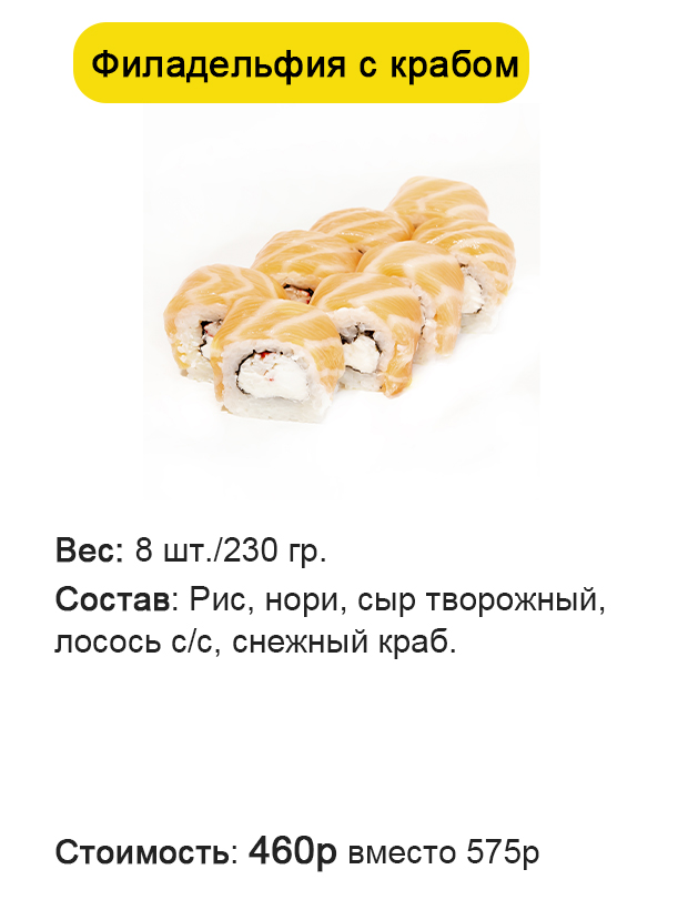 • Филадельфия с крабом, 230г, 8 шт. – 460 руб. вместо 575 руб.