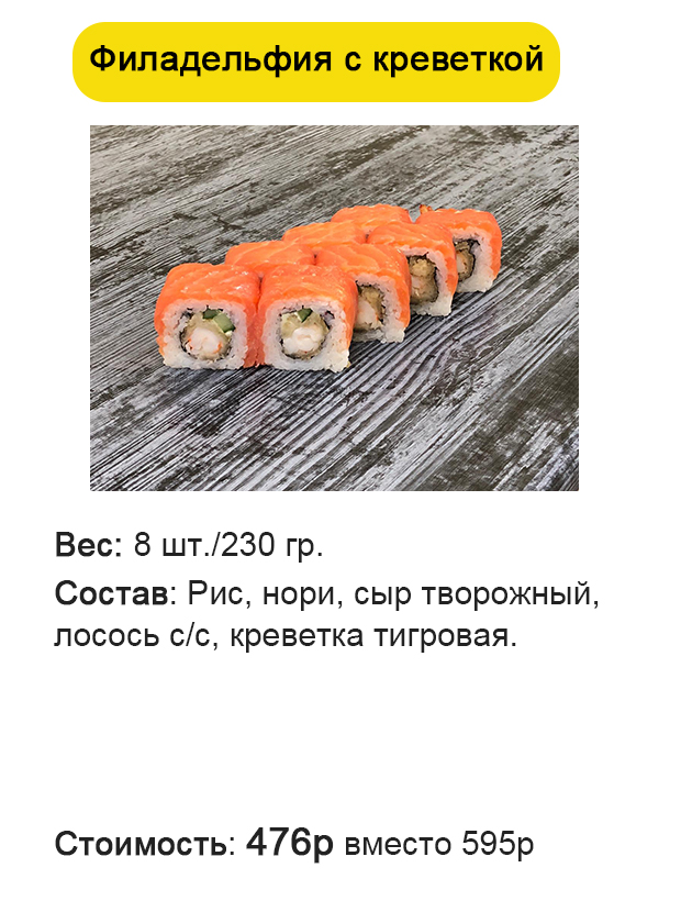 • Филадельфия с креветкой, 230г, 8 шт. – 476 руб. вместо 595 руб.