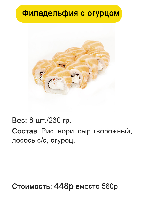 • Филадельфия с огурцом, 230г – 448 руб. вместо 560 руб.