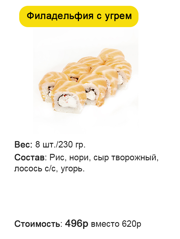 • Филадельфия с угрем, 230г, 8 шт. – 496 руб. вместо 620 руб.